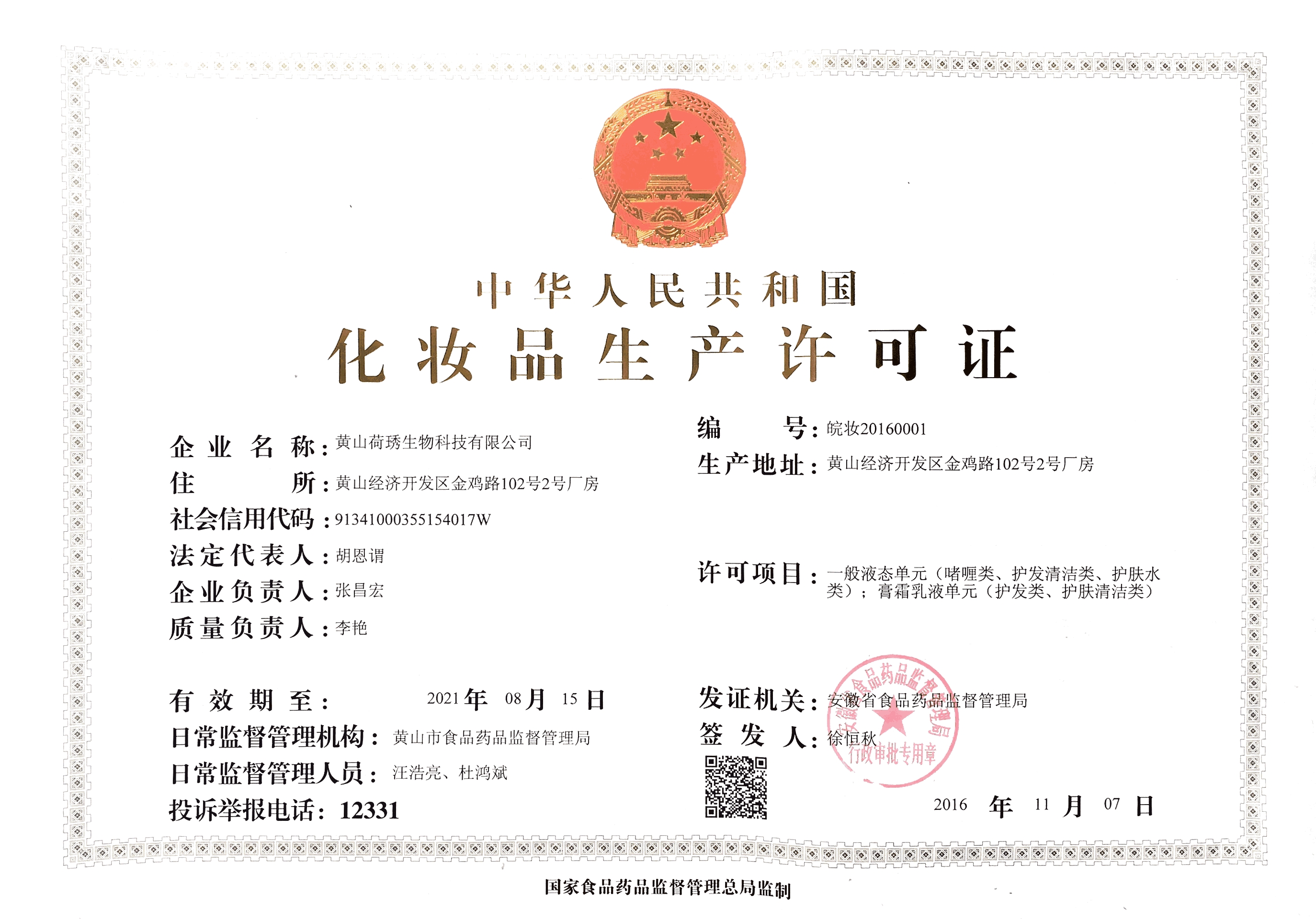 2016年8月16日,黃山荷琇順利通過(guò)安徽省食品藥品監(jiān)督管理局行政審評(píng)及現(xiàn)場(chǎng)審核,取得《化妝品生產(chǎn)許可證》,投入正式生產(chǎn)。此次獲證是國(guó)家二證合一新規(guī)實(shí)施后安徽省首家獲得《化妝品生產(chǎn)許可證》企業(yè)。